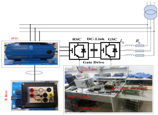 The proposed FERL-based SMC approach is further tested via experiments. The test bed is made of a 2 kW induction generator, a 0.7-kW doubly fed inverter and necessary current/voltage sensors [50]. It is worth noting that the nominal power of the inverter has no direct relationship with the nominal value of the wind turbine. Instead, it is decided based on the storage battery nominal value and the load value. When there is a load, the nominal value of the inverter power should be 10–30% larger than the load value. A 1716 Data Acquisition Card is employed to connect the sensors with computer. A dSPACEDS 1103 DSP (Texas Instructment, Dallas, TX, USA) board is utilized to control the RSC and the GSC. A TMS320F2812DSP (Texas Instructment, Dallas, TX, USA) is employed to serve as the microprocessor which generates the control signal for the DFIG-based WECS with 20 MHz frequency. The test bed is shown in Figure 13. The remaining parameters are initialized to be the identical as those of the simulation. The wind speed file is adopted from Cangnan Wind Energy Center in Zhejiang Province (China) and the horizon of the wind file is also 20 s.