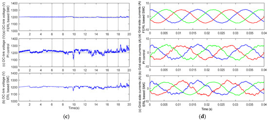 It is evident that the ERL-based SMC contains high frequency chatter, while the actual active power of the FERL-based SMC tracks the reference curve well without obvious chatter. Figure 14c shows the DC-link voltage curves of the three methods and it can be seen that the DC-link voltage of the proposed method remains stabilized. Figure 14d shows the grid side currents of the three methods. Their THD levels are 1.35%, 7.29%, and 7.97%, respectively. The chatter elimination capability of the proposed method guarantees that the actual power curves can track the reference curves smoothly. Hence, the system can operate in a more ideal state.