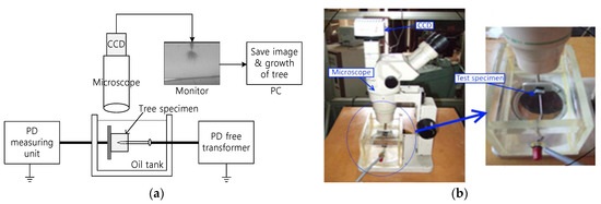 In order to check the occurrence and growth of tree, an optical microscope (Olympus, Tokyo, Japan) was installed above test specimens immersed in the oil tank as shown in Figure 3b. The microscope was connected to the computer through Charge Coupled Device (CCD) camera as shown in Figure 3a. The growth image of tree was able to be observed and recorded on computer.