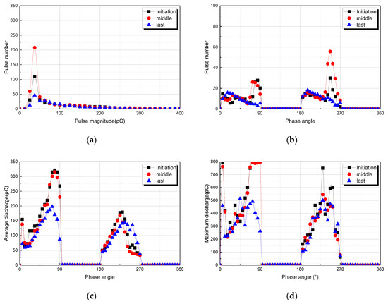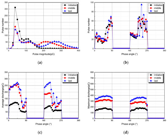 Figure 5a–d show electric discharge distributions during the tree propagation in model 2. Much like in the case of model 1, the repetition rate of PD is more frequent in the positive half cycle than in the negative half cycle in model 2. PD magnitude has shown to be greater in the positive half cycle than in the negative half cycle. Both the mean and largest PD magnitude are greater in the positive half cycle. This seems to be the result of the existence of a void in the needle tip in model 2, unlike in the case of model 1. This phenomenon also shown the same characteristics even when there was a metallic foreign material in model 3. Model 2 shows similar characteristics in the PD pulse repetition rate, its growth is clearly classified into the initiation stage, the middle stage, and the final stage in terms of the PD magnitude. In addition, as the tree propagation proceeds further towards the last stage, the data on the discharge pulse above 300 pC shows the greater PD pulse repetition rate.