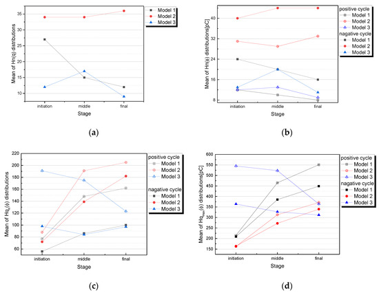 Figure 7a–d show the variation of mean value of statistical distributions of PD in order to investigate PD tendency according to tree propagation stage for each artificial tree models.