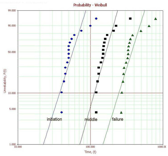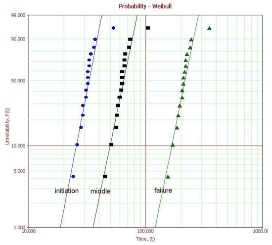 Time to failure of the Weibull distribution of tree model 2 (divided by three progress: initiation, middle, failure).