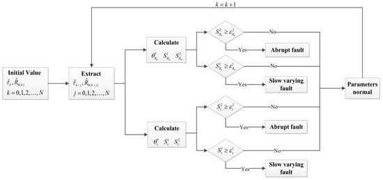 where means the fault is happening, and means no fault. The slow-varying-type fault thresholds and the abrupt-type fault thresholds—which could be chosen by experience or by trial and error tests—are defined as and , respectively. The fault map is listed in Table 1 according to the fault detector. The diagnosis initializes with the following process, and the diagnosis flow-chart is presented in Figure 3.