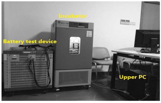 For verifying the effectiveness of the diagnosis proposed in the paper, the experiment is conducted through simulating the abrupt-type fault and slow-varying-type fault of a Li-ion battery by controlling the battery ambient temperature as a case study. The battery parameters are estimated in real time, and the battery faults are diagnosed by comparing the algorithms of AUKF and UKF in this case. The test bench consists of a BTS-4000 battery test device, an auxiliary data acquisition channel, a BLH-100 incubator, and an upper PC and monitor software, as shown in Figure 4. The battery type that we have chosen for the experiment is WX-14I3320 . The specification of the battery is listed in Table 2.
