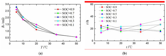 where is the maximum available capacity. The nonlinear relationship between OCV and SoC is variable with the temperature. Three OCV–SoC curves in 5 °C, 20 °C, and 50 °C have been obtained from the experimental data, and are shown in Figure 2. Since is insensitive to temperature, the nonlinear function is fitted with a 7-order polynomial function: