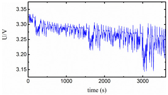 For simulating the slow-varying-type fault, we dropped the ambient temperature from 50 °C to 5 °C in the incubator over a time of 0–3600 s. The measured voltage value is shown in Figure 7. The results of comparison among the estimated values gained using the algorithm of AUKF, the estimated values gained using the algorithm of UKF, and the real values, are plotted in Figure 8a. It shows that the trend of given by AUKF is the same as the real value. Both algorithms are effective and insensitive with initial values during the estimation before 1000 s. After 3600 s, the AUKF estimation value reaches 2.88 mΩ with a relative error of 15.3%, while the UKF estimation value reaches 1.62 mΩ with a relative error of 43.8% which shows poor tracking ability. It indicates that the algorithm of AUKF has better robustness than UKF.