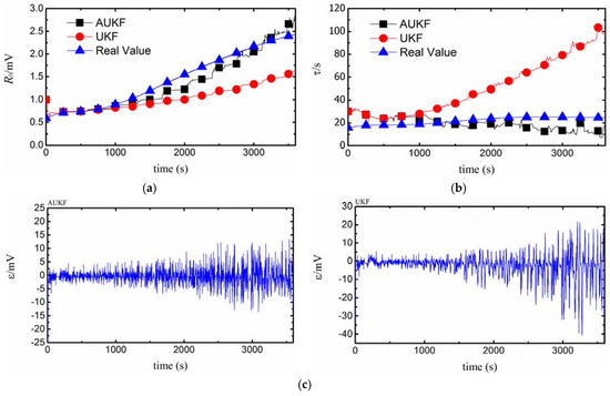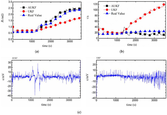 The AUKF and UKF have different estimation trends of time constant after 800 s, as shown in Figure 8b. The relative estimation error of from using the AUKF after 3600 s is 30.8% compared with the real value of . The high error is due to the relatively low ECM accuracy, poor identifiability of polarization resistance and polarization capacitance, etc. However, the UKF estimation is divergent after 800 s.