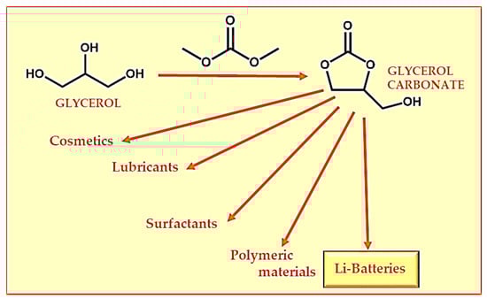 Glycerol carbonate is a high valuable product with a wide scope of potential applications and a market price as high as of US $8141/ton [] that can be obtained at low cost and high volume from glycerol. Some of these uses are as an intermediate in the synthesis of polymers such as polyesters, hyper-branched aliphatic polyethers, polycarbonates, polyurethanes, polyamides, surfactants, lubricating oils, cosmetics or electrolytic carriers in lithium-ion batteries [,]. Glycerol carbonate can also be a green alternative to a set of equivalent fossil derivative compounds such as ethylene or propylene carbonate. Glycerol carbonate can be obtained industrially through transesterification with dimethyl carbonate, as an acyl acceptor (Figure 2), with a heterogeneous catalyst producing methanol as by-product, therein allowing for a straightforward separation and purification of glycerol carbonate, beginning with the separation of catalyst by filtration and followed by solvents evaporation with almost 100% yield. Excess dimethyl carbonate is employed to drive the reaction equilibrium towards the production of the desired product. The procedure of separation by evaporation of compounds is due to the huge boiling point difference between the excess dimethyl carbonate and methanol, compared with glycerol carbonate. Although the glycerol carbonate synthesis through transesterification can be performed without adding a catalyst [,,] its use is, of course, very benefical. As examples of homogeneous catalysts that can be used in the reaction, figure carbonates of potassium and calcium or hydroxides of potassium and calcium. Those catalysts can work at conversion ratios and yields higher than 95% with reduced reaction time, with dimethyl carbonate/glycerol and catalyst/glycerol molar ratios of 5 and 0.1, respectively [].