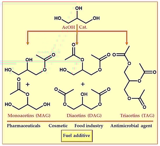 Another alternative route for conversion of glycerol produced from biodiesel is the acetylation via esterification (Figure 3) [,,,]. The resulting mono-, di- and triacetylesthers have great industrial applications. The triacetylated derivative is known as triacetin (TAG) which can be used in the cosmetic and food industry, as a fuel additive, and as an antimicrobial and emulsifying agent in pharmaceuticals and cigarette filters. The mono- (MAG) and diacetylated (DAG) esters are also known as mono- and diacetin and have uses as cryogenics and as feedstocks for the production of biodegradable polyesters. These glycerol acetyl compounds exhibit physicochemical properties of BD-like fuel and can be utilized in diesel engines as additives for viscosity reduction without modification.