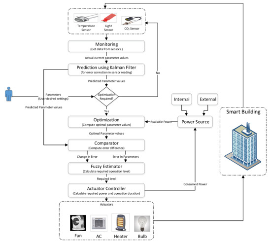 The flowchart of the proposed system is shown in Figure 3. The process begins with reading current indoor parameter values (temperature, air quality and illumination level) from sensors inside the building. The Kalman filter algorithm is applied to remove error in sensor readings and to predict actual parameter values. Afterwords, in the optimization check, we see if any parameter value is outside the desired user range, then optimization is applied. For the optimization, we have used two algorithms—genetic algorithm (GA) and particle swarm optimization (PSO)—to compute optimal setting for each parameter in order to get the desired environmental condition inside the building. Finally, these parameters are passed to the actuator controller module in order to send the operation command to the respective controllers to adjust its operation level accordingly. The system has an internal database for storing collected data for comprehensive analysis of the system performance gain and resource savings. An interface is also provided to users in order to specify system parameters, e.g., desired (acceptable) ranges for temperature, illumination and air quality.