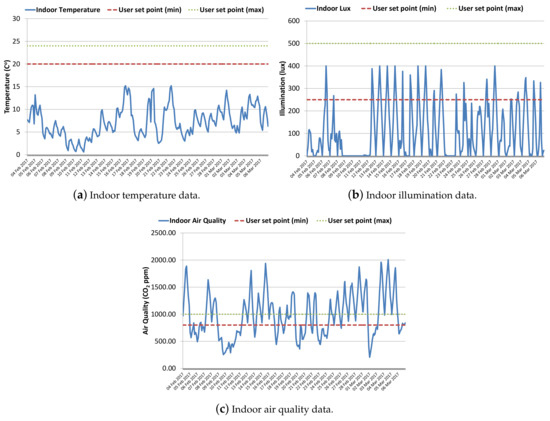 Table 2 present a summary of data presented in Figure 4. Temperature values remain below 15 C as the data are collected for February and early March, which is the end of the winter season in Jeju. The user’s acceptable range for indoor temperature is , so we need to operate heaters to adjust indoor temperature as per user set points. Cooling is not required in these experiments, as temperature never goes beyond user set points. The X-axis label indicates the day, but hourly data are plotted; and short cycles within the data indicate maximum and minimum temperature during the day and night time, respectively. Varying peaks in temperature data reflect the frequent variability in Jeju’s weather. The average value for indoor illumination data (i.e., 108.33 lux) indicates that we need to use auxiliary lighting most of the time to maintain indoor illumination within the user-desired range. User set points for illumination are selected as per the standard recommendation for office lighting [35]. Short cycles with rising peaks in illumination data indicate maximum and minimum illumination during the day and night time. In Figure 4b, flat (near zero) values can be seen in illumination data from 9 to 11 February, which indicate cloudy weather outside resulting in low indoor illumination. Low temperature values for the same period also confirm cloudy/raining weather. Indoor air quality is measured in terms of CO concentration. Repeated cycles within air quality data indicate the maximum and minimum CO concentration during the day (mostly occupied) and night (less occupied), respectively. Varying peaks in indoor air quality data indicate the impact of outdoor weather and wind speed on the indoor environment. The typical concentration of CO in the outdoor environment ranges from 300 to 500 ppm; thus, an acceptable range from 800 to 1000 is selected for indoor CO concentration as per the American Society of Heating, Refrigeration, and Air Conditioning Engineers (ASHRAE) standard [36].