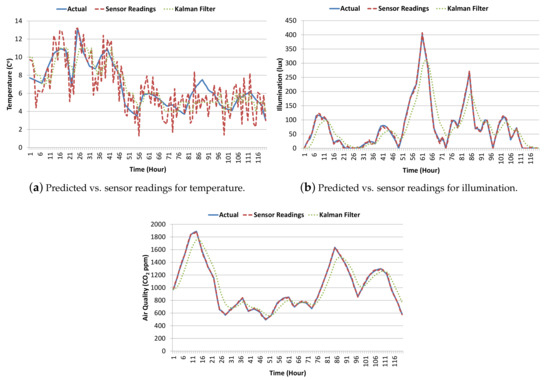 Using the Kalman filter algorithm, our objective is to predict actual parameter values as shown in the results graph. Results show that the Kalman filter algorithm was able to remove error (noise) in the sensor readings and predict actual indoor environment parameter values as shown in Figure 6. For better visualization, we only show the first five days (120 h) of results in these figures.