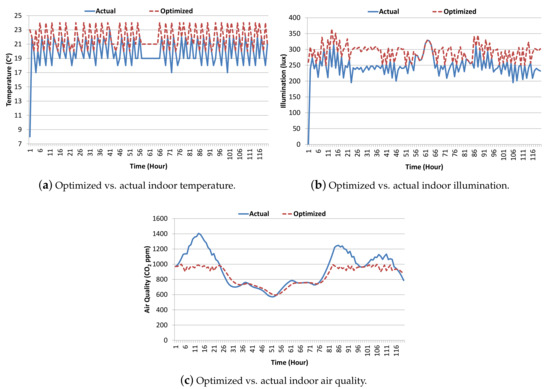 The first part in our optimization formula controls the temperature level such that the maximum user comfort can be achieved. The second part is for maintaining the desired illumination level inside the building. Similarly, the third part is for maintaining the desired air quality inside the building. The formulation tries to get the maximum out of each of the three components, but it will result in increased energy consumption, i.e., loss in the fourth part of the optimization function, which is included for energy optimization. As stated earlier, each parameter value can be selected anywhere between the range as given in Table 2. The optimization approach tries to find a balancing point in order to have minimum power consumption with maximum user comfort. Figure 7 presents the first five days (120 h) of results to show the impact of the optimization on the indoor environmental parameters of temperature, illumination and air quality, respectively. Actual data indicate the environmental parameter values before optimization. These results illustrate the impact of optimization on the indoor parameters, and we can easily extract the amount of change made in each parameter by comparing the corresponding actual and optimized values. For instance, in Figure 7a, the initial indoor temperature is 7.6 C and the corresponding optimal temperature was set to 23 C. The increase in indoor temperature can be seen from the second hour. Afterwards, a constant fluctuation in indoor temperature is observed, which is due to the cold external temperature, which pulls down the indoor temperature, whereas the optimization process pulls it up by keeping it within the user-desired range . Similarly, in Figure 7b, initial indoor illumination is 0 lux (night time) and the corresponding optimal illumination was set to 260 lux. The increase in indoor illumination can be observed as being due to external day light and internal auxiliary lighting. Afterwards, a constant fluctuation in indoor illumination can be seen, which is attributed to the variation in external day light. The optimization process ensures indoor illumination to be inside the user-preferred settings, i.e., . During Hours 60 to 65 (on 6 February), the actual and the optimized indoor illuminations are the same because the actual illumination is within the user-desired range, so the optimization is not required. In fact, 6 February was a clear sunny day in Jeju. Indoor air quality optimization is done when the indoor CO level goes beyond user set points, i.e., greater than 1000 ppm, as shown in Figure 7c. Furthermore, we can observe cycles in indoor CO depending upon indoor occupancy i.e., rise during day time and fall during night time. On 5 and 6 February, indoor air quality is good due to external high speed wind approaching 40 km/h approximately which helps in auto ventilation of indoor environment.