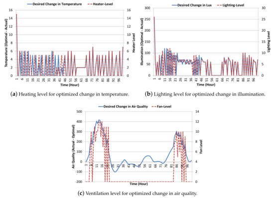 The optimization process results in the change in actual indoor parameters through necessary adjustment in the actuators’ operational level. The actuators’ operational level needs to be changed according to the desired change in the indoor parameters. Figure 8 shows the first four days of results (100 h) of the desired change in the indoor parameters along with the corresponding actuators’ operation levels for temperature, illumination and air quality, respectively. The desired change in the indoor parameters is plotted against the primary vertical axis, and the corresponding actuators level is plotted along the secondary vertical axis. The heater operation level reflects the desired change in temperature, i.e., for an increase of x °C in temperature, and the heater operation level needs to be set to x, as shown in Figure 8a. In the beginning, where a 15 °C change in temperature was required, the heater operation level was set to 15. Afterwards, a small change in the heater operational level is made along with the fluctuation in indoor temperature. Similarly, the lighting level reflects the desired proportional change in illumination, i.e., lighting operational level x indicates a change in indoor illumination, as shown in Figure 8b. In the beginning, where a 260 change in illumination was required, the lighting operation level was set to 26. Afterwards, adjustment of the lighting operational level is made along with the fluctuation in indoor illumination. The fan operational level reflects ventilation desired for a proportional change in indoor CO concentration, i.e., a unit rise in fan operational level results in a 50-ppm change in indoor CO concentration, as shown in Figure 8c. During the second and third day when the indoor air quality is good (within the desired user set points), the fan actuator need not be operated. On the fourth day, adjustment of the fan operational level is made along with fluctuations in indoor air quality.