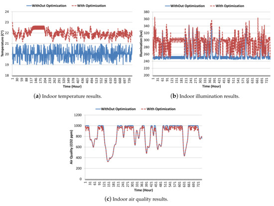 No-optimization scheme makes minimal changes and keeps the indoor parameters on the boundary line with user set points. Indoor temperature without optimization fluctuates around the user’s least acceptable value, i.e., 20 °C, as shown in Figure 9a. However, variation in indoor temperature is observed with the optimization scheme. Similarly, the no-optimization scheme results for indoor illumination and air quality remain around 250 lux and 1000 ppm, respectively. Rising peaks in indoor illumination results for the no-optimization scheme in Figure 9b are due to external day light, as can be seen in the original data for indoor illumination given in Figure 4b. The difference in air quality results for both schemes can be seen at points where the indoor CO concentration goes beyond 1000 ppm, as shown in Figure 9c. The no-optimization scheme results for indoor air quality stay just around 1000 ppm, whereas the optimization scheme tries to pull this back below 1000 ppm as much as is feasible.