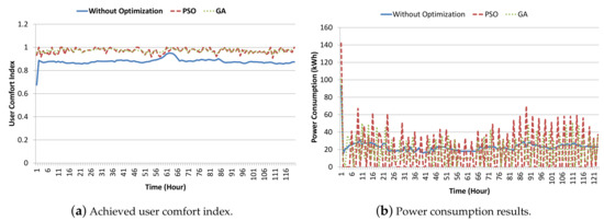 The no-optimization scheme target was to keep indoor parameters on the boundary line with user set points, but due to rapid fluctuations in the external environment, it failed to maintain the desired user settings all of the time. Particularly, temperature and indoor illumination results given in Figure 9a,b indicate that the no-optimization scheme’s performance deteriorated with respect to user set points. This results in degradation of the overall user comfort index for the no-optimization scheme, i.e., 0.87 (on avg.), as shown in Figure 10a. Furthermore, contrary to expectations, the no-optimization scheme also resulted in more energy consumption, as shown in Figure 10b. This is due to the fact that one or more actuating devices are operational all of the time, and the power consumption graph stayed around 20 kWh. Total energy consumption during 31 days for the no-optimization scheme was about 15.96 MWh, whereas PSO and GA resulted in 12.13 MWh and 11.63 MWh, respectively. Both optimization algorithms, PSO and GA, try to find optimal values for indoor parameters away from the boundary line of user set points, which results in higher instant energy consumption, as indicated by the peaks in Figure 10b. This strategy not only helps with maintaining the indoor environment as per the user-desired settings for a longer period of time, resulting in improved user comfort, as shown in Figure 10a, but also creates an automated duty cycling effect for actuating devices, allowing them to turn off and save energy. This phenomenon is reflected by the repeated cycles in the power consumption graph in Figure 10b for the PSO and GA results. Compared to GA, PSO stretches the optimal values for the indoor environment parameter a little longer and results in higher peaks for power consumption. However, higher peaks of energy consumption in PSO result in little to no improvement in the user comfort index (0.967) as compared to the GA results (0.964). In other words, we can say that GA outperforms the PSO algorithm, as GA can give almost the same user comfort index results as the PSO algorithm, but with relatively low energy consumption.