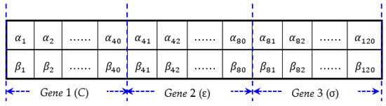 Step 1. Set up quantum chromosomes. In this paper, the quantum chromosome is composed of a string of m qubits (superposition of all possible states), as shown in Figure 2. These SVR’s three parameters, C, , and , are presented into the quantum qubit superposition format, i.e., each chromosome has three genes to represent it. Based on the authors’ practical trials and experience, choosing a gene with 40 bits could produce more satisfactory results, thus, a chromosome in total contains 120 qubits (i.e., m = 120). A gene that contains more qubits would be associated with better partitioning around the space.