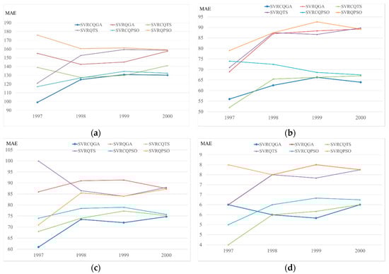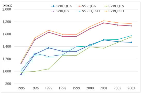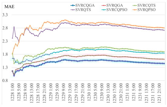 Figure 7 also provides a good illustration of the cumulative differences of MAE for each competitive model. The competitive models also include the SVRCQPSO [27], SVRQPSO [27], SVRCQTS [28], and SVRQTS [28] models.