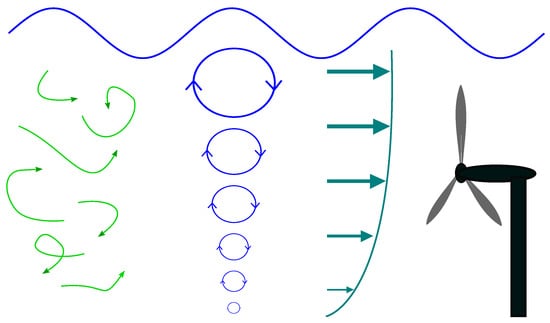 Diagram of the causes of unsteady loads on tidal turbines. Shown from left to right: turbulence, waves and shear flow.