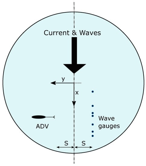 Sketch of the test set-up showing relative positions of the ADV and wave gauges to the tank-centreline. Note that circle represents a small, approximately 5-m region, in the centre of the tank, and does not depict the tank circumference (25 m).