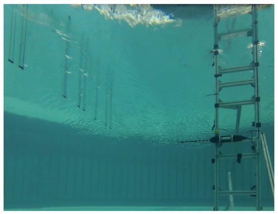 Under-water image of the test setup. Taken using a camera mounted to the tank floor.