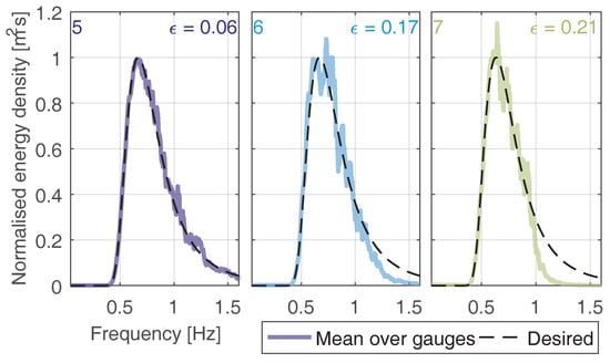 As mentioned in Section 3.2.2, it was desired to obtain ‘corrected’ wave spectra for the irregular sea states defined in Table 3. Due to the interaction with the current field, wave amplitudes are not as specified and require correction. Linear frequency-dependent correction factors are calculated via Equation (18). In this case,  is defined as the mean spectrum over the gauges obtained from an FFT. The error between target spectrum and measured is calculated from Equation (19).
