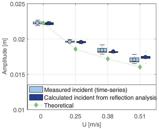 From Figure 6, it is evident that the two approaches of estimating the incident wave amplitudes agree well with each other. This serves as a good proof of the reflection analysis method in combined wave-current and gives confidence in the application to irregular sea states. It is also clear that decreased repeatability is observed in higher current conditions, indicated by the larger inner quartile range of the box plots. This is discussed further in Section 4.2.2.