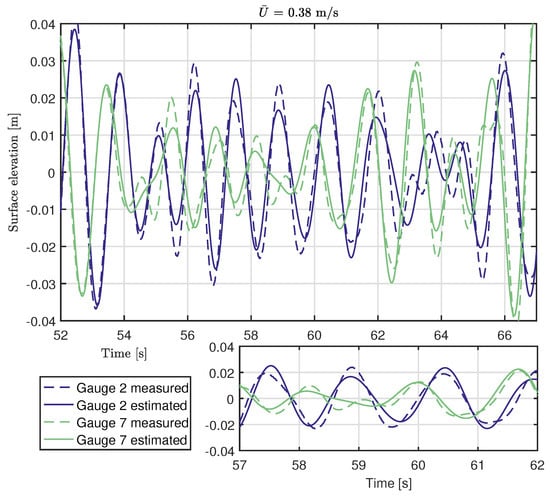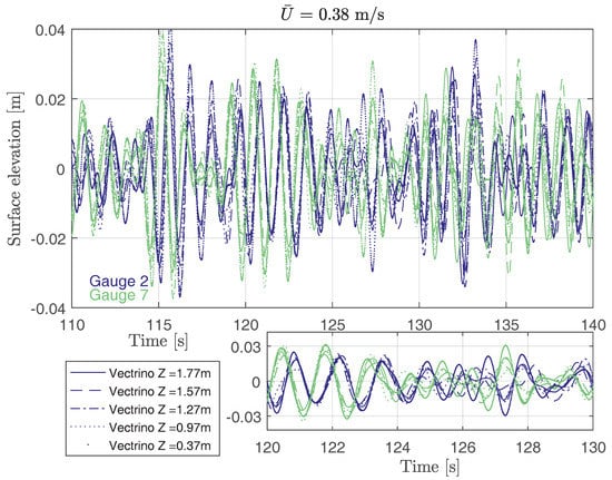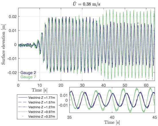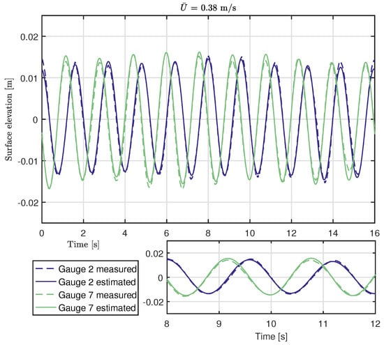 The outputs of the reflection analysis procedure (Section 2.2.1) essentially provide complex incident and reflected amplitude spectra,  and . As the phase is preserved, it is possible to simulate the expected total time series at any x-position and, hence, validate against the measured data at the various gauge positions. In each case, the phase that is incorporated into the complex values is relative to x = 0 m, and as such, they need to be shifted to the gauge x-positions defined in Table 1 for comparison. This can be done in a similar manner as is described for velocity spectra in Equations (16) and (17). Applying an Inverse Fast Fourier Transform (IFFT) to the transformed spectra provides the expected time series at the gauge positions. Examples for regular and irregular sea states are displayed in Figure 11 and Figure 12, respectively. As in previous examples, the 0.38-m/s current cases are used, and Gauges 2 and 7 are displayed. Repeat 3 is shown; however, the results are extremely similar for each of the five repeats (ADV z-positions).