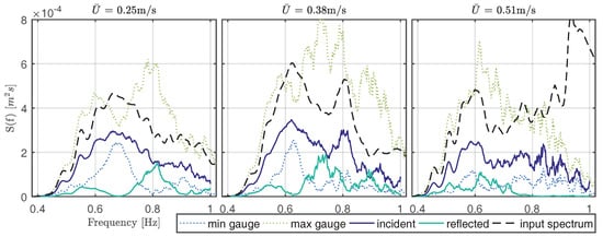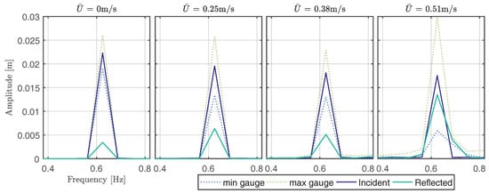 The resulting incident and reflected spectra for the regular wave cases (Sea States 1–4) are shown in Figure 9. It is noticeable from this figure that the reflections are larger in increased following currents at FloWave. This is partly a result of reflected waves interacting with a larger opposing current, hence increasing in amplitude. It is also known, however, from Draycott et al. [] to be partly a result of poorer absorption performance of the force-feedback wave paddles in current. The minimum and maximum amplitudes measured over the wave gauge array are also shown in the Figure 9, and it is clear that reflections introduce significant spatial variability in the wave field in high current conditions.