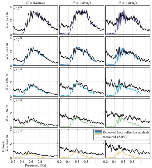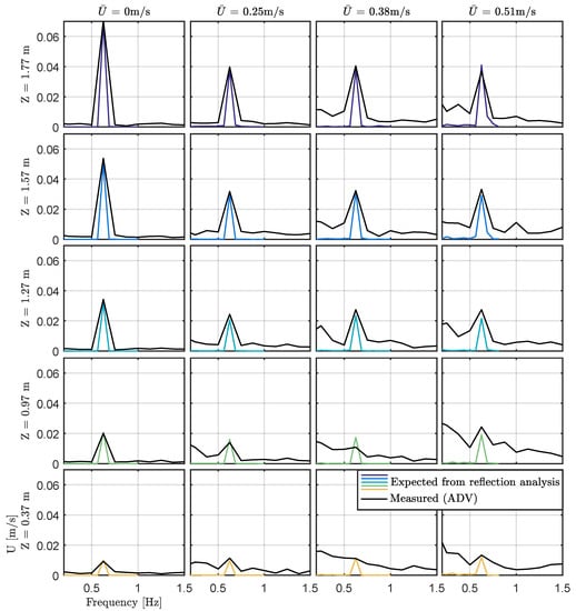 Without knowledge of the incident and reflected wave spectra, and a frequency-dependent phase relationship between them at a given position, it is not possible to estimate the wave-induced velocities. Once the two systems are well defined, it is possible to estimate the horizontal and vertical particle velocities through Equations (14)–(17) and compare with measurements. The results of this are shown for the regular and irregular sea states in Section 4.4.1 and Section 4.4.2, respectively.