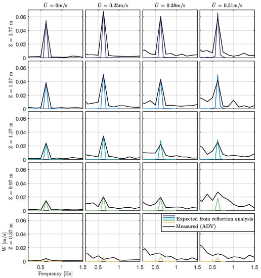 The predicted horizontal U, and vertical, W, velocity spectra compared with the measured equivalents from the ADV are shown in Figure 13 and Figure 14, for Sea States 1–4 at each of the five depths. As these are monochromatic sea states, the FFT has been applied so that the wave energy all lies within a single frequency bin. This allows for fair comparison. It is evident that the estimates are overall very good, with slightly larger deviations observed in higher velocity conditions further down in the water column.
