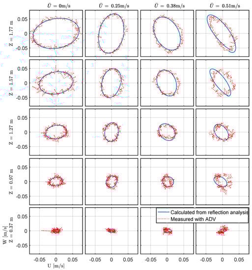 Without obtaining the correct phase relationship between the incident and reflected spectra, the estimated velocity magnitudes would display large deviations from the measured equivalents. This would make it difficult to validate the application of linear wave theory in these sea states. The spatially-variable relationship between incident and reflected waves also causes deviations from the typically expected wave orbital motions, which are shown via the relationship between U and W velocities. This can be predicted by simulating time series of U and W over an individual wave period. This is shown in Figure 15 compared with the measured equivalent. With the aim to remove the influence of turbulence, the measured equivalent is taken as the average ‘orbital’ over the last 16 s, i.e., the mean of exactly 10 wave cycles at T = 1.6 s.