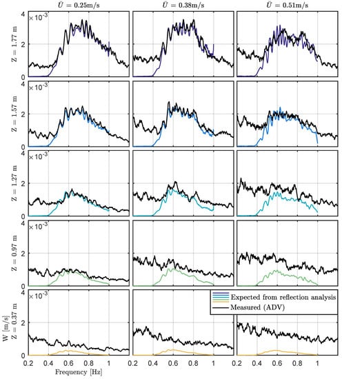 The velocity spectra for irregular waves, compared with those expected from the wave analysis, are shown in Figure 16 and Figure 17. Similarly, it is observed that the estimates are very close to the measured spectra, with slightly worse results detectable for the 0.51-m/s case. The ‘spiky’ variation observed is due to the ADV being at constructive and destructive interference locations, which is a function of frequency. A destructive location in U for a given frequency is a constructive point for W and vice versa, i.e., partial standing waves are formed. The estimated wave-induced velocity spectra are extremely similar to the measured and describe the interference-induced variations very well. Interestingly, for both the regular and irregular sea states, it appears that the wave surface elevations alone can be used to predict the velocities across the relevant wave frequencies. This is particularly true for low to medium-high current velocities and reasonably valid for high current velocities higher up in the water column. This suggests that wave effects are dominant in these conditions.