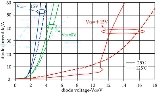 The operating characteristics of the RC-IGBT integrated diode are affected by the gate voltage, and the application of the gate voltage can change the flowing path and the recombination process of the carriers. The gate pulse voltage can affect the forward voltage drop of the integrated diode in RC-IGBT. As shown in Figure 2, the V-I characteristic curves of the integrated diode at 25 °C and 125 °C working temperatures are given for different gate voltages. The arrow in the figure shows that the gate voltages are −15 V, 0 V, and 15 V, respectively. The greater the gate voltage, the higher the forward voltage drop across the same current level will be. In the two level PWM control, driving signal of the conventional IGBT was not considering the working state of the diode; otherwise, in the application of driving RC-IGBT, the diode conduction state should be detected to impose the low level gate voltage on the RC-IGBT for the aim of reducing the diode conduction loss [18,19].