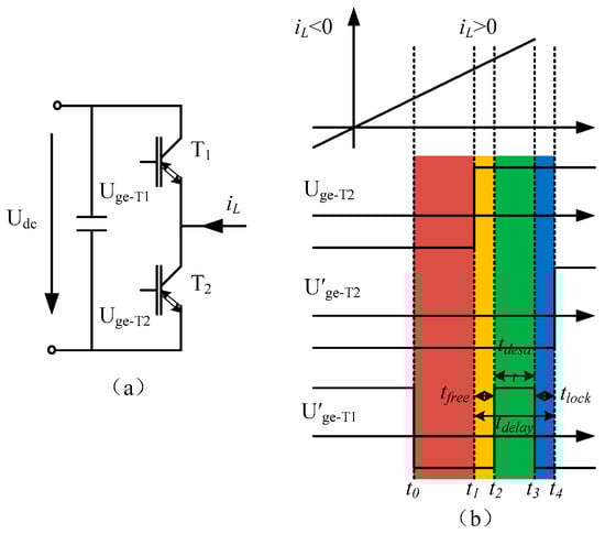 Figure 3b shows the sequential logic of the desaturation pulse U′ge-T1. The T1 turns off at the time t0, the diode starts to be free-wheeling, the order of the T2 turning on is execute at the time t1, the desaturation pulse starts to be applied to the T1 at the time t2, it stops being applied to the T1 at the time t3, and the T2 turns on actually at the time t4. Because the time of turning on of the T2 cannot be predicted in advance, the gate level pulse signal of T2 is delayed, and the delay time is tdelay. The tfree is the system processing time, the tdesat is the desaturation pulse width, and the tlock is the dead time. Similarly, when the load current IL is reverse (outflow node), it is necessary to detect the forward conduction time of the T1, and to also apply the desaturation pulse to the T2 [21,22].