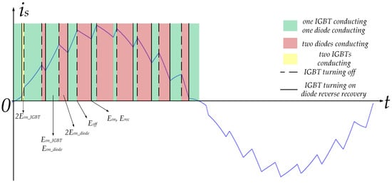 The green region corresponding to one IGBT conduction loss and one diode conduction loss, the red region corresponding to the conduction loss of two diodes, and the yellow region is corresponding to the conduction loss of two IGBTs. The dashed area corresponding to the loss of the IGBT turning off, and the solid line region is corresponding to the IGBT turn-on loss and diode reverse recovery loss.