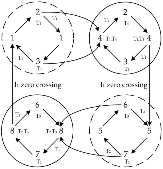 According to the working mode of the PWM converter with RC-IGBT gate desaturation control, Figure 6 shows the desaturation control process of the single-phase PWM converter in the traction condition. The solid line boxes represent the alternating work processes of the rectification working mode and the power supply short circuit mode, while the dashed boxes represent the alternating work processes of the inverter working mode and the power short circuit mode. The letters on the arrow represent the devices, which need to be desaturated in the corresponding working mode. At this point, a desaturation pulse is applied depending on the direction of the inductor current and the state of the switch on the opposite side. The letters around the digits correspond to devices in the diode mode that need to be applied to the low drive voltage. The operating states 4 to 5 and the working states 8 to 1 will lead to an inductance current zero crossing. In other words, the full devices will switch from diode mode to IGBT mode. In addition, the desaturation control process of the PWM converter in the regenerative condition is similar to that in the traction condition.