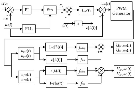 The four channels’ voltage generated by the PWM generator is processed by the logic of desaturation. The relations of the gate voltages are described as Formulas (16) and (17). uge_des1(t)~uge_des4(t) are the four gate voltages after desaturation. The ε(t) is the step function. While the current is positive, ε[is(t)] = 1, and the current is reverse, ε[is(t)] = 0. fdelay and fdes are the delay function and the desaturation processing function, respectively.
