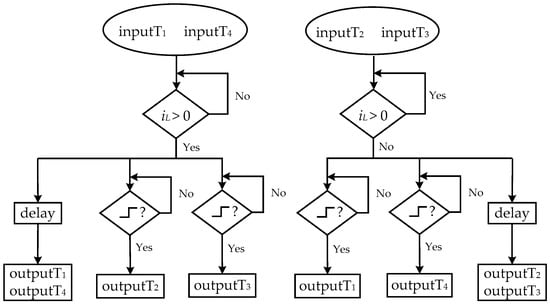 The inputs T1, T2, T3, and T4 in Figure 8 are four conventional input signals with a dead time of 5 μs, and the inductor current, iL, is also an input. The four output signals are outputs T1, T2, T3, and T4. The direction of the input current iL is judged firstly. When its direction is forward, the pulse generations of the T1 and T2 are analyzed together. Because the T1 has been in diode mode in this process, the driving voltage of the T1 should be low. In addition to meeting the needs of the gate of the RC-IGBT in diode mode that is applied to the low voltage, the desaturation pulse must also be imposed to reduce the diode reverse recovery loss. Importantly, the rising edge of input T2 should be detected, the output T1 is obtained by the desaturation pulse procedure of input T2. At the same time, the output T2 can also be obtained by delaying the input T2 for the time tdelay. Similarly, the pulse generations of T3 and T4 are based on the desaturation pulse procedure and the delay of input T4. The process of the reverse input current is treated similarly.