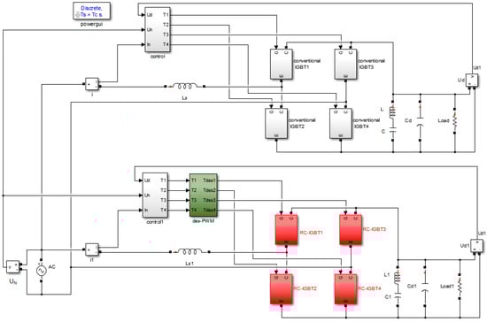 Figure 10 shows the models of the predictive current control of the conventional IGBT PWM rectifier and the improved predictive current control with desaturation pulses of the RC-IGBT PWM rectifier under the same simulation parameters.