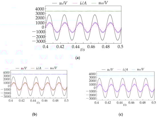 The simulation results are shown in Figure 11. The output voltage udc, the grid voltage us and the inductor current is are shown under different operations: (a) the conventional IGBT PWM rectifier; (b) the RC-IGBT PWM rectifier under the desaturation control of the current threshold 10%; and, (c) the RC-IGBT PWM rectifier under the all period desaturation control. It can be seen from the diagram that the three control methods can all ensure the DC output stable at 3500 V. The voltage and current of the grid keep synchronous, using fast Fourier transformation (FFT) analysis, the grid current total harmonic distortion (THDs) are 2.02% under saturation control, 2.01% under desaturation control of the current threshold 15%, and 2.01% under all period desaturation control. The system works stably in the rectifier state.