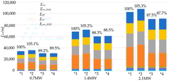 The RC-IGBT loss calculation is similar to that of the conventional IGBT, including IGBT switching loss and conduction loss, diode conduction loss, and reverse recovery loss [24]. The calculation of the IGBT switching loss and conduction loss for RC-IGBT is as the same as that for conventional IGBT, without considering if the RC-IGBT worked under RCDC or not. The calculation of the diode loss of RC-IGBT under saturation control is consistent with that of the conventional IGBT diode. Under the diode desaturation control, the calculation method is similar, but the selected parameters are different according to the desaturation pulse. The loss difference between the RC-IGBT under the desaturation control and the RC-IGBT under the saturation control (the conventional IGBT) is analyzed as following. During a switching period, the difference of the IGBT turn-on loss is defined as ΔEon, the conducting loss and the turn-off loss are the same (constant, if the conventional IGBT), the difference of the diode conduction loss is defined as ΔEon_diode, and the difference of the diode reverse recovery loss is defined as ΔErec. Under the two control conditions, the total loss variation of RC-IGBT, ΔEtot can be expressed as: