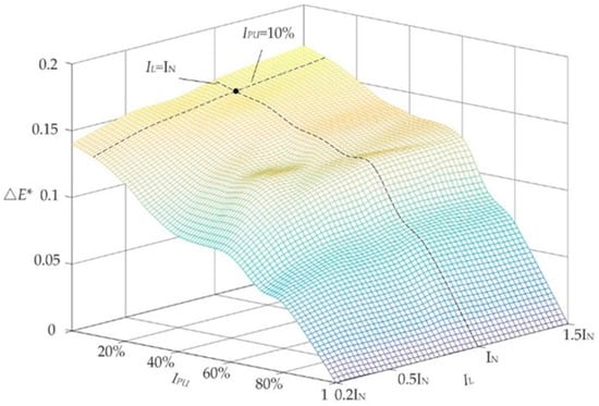 By using the MATLAB three spline interpolation to set up the binary relation among IL, IPU and ΔE*, the three-diensional (3D) graphs of which are shown in Figure 13. When the IPU is less than 0.1, the ΔE* does not change significantly; when the IPU is higher than 0.1, with the decrease of IPU, the ΔE* increases significantly. Taking the rated load as an example, when the IPU is 0.1, the maximum value 0.16 of ΔE* is obtained. When considering repeatability and small current low loss characteristics near the zero current of the load current, the optimal graph of the loss decrement of the PWM converter is drawn, namely IPU 10%, the curve of ΔE* and IL. In addition, Figure 13 also shows the curve of ΔE* and IPU when IL is IN. The intersection point of the two curves is the best working point of RC-IGBT single-phase PWM rectifier under rated conditions.