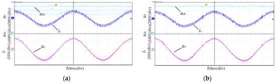 The steady state experimental waveform PWM converter is under saturation control and all period desaturation control. As shown in Figure 15, the output voltage udc under conventional control is about 350 V, which is 1.79 times the grid voltage, and the ripple voltage is small. Although the switching frequency is low, the AC side current waveform is still close to the sinusoidal waveform, with a power factor equal to 1. At the same time, under saturation control, the output voltage and output current waveform of the PWM converter are almost the same as those under saturation control. Through the grid side current waveform data are analyzed by the MATLAB FFT function, the THD of the gird side current is 4.76% under saturation control. Those of desaturation pulse width 50 μs are 4.60% under all period desaturation control. The results prove that the desaturation control is effective and feasible.