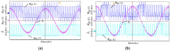 Figure 16 compares the gate voltage waveforms of T1 and T2 under saturation control and all period desaturation control. It can be seen from Figure 16b that T1 is desaturated and the gate pulse of T2 is unchanged under desaturation control when the grid current is positive. When the grid current is reverse, T2 is desaturated and the gate pulse of T1 is unchanged.