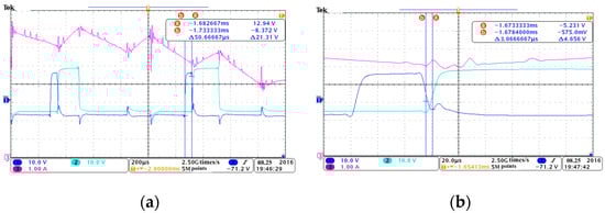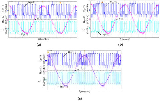 Figure 18 shows the gate voltage waveforms of T1 and T2 under the condition of (a) the current threshold = 2 A corresponding to a loss decrement threshold per-unit value of 0.13, (b) the current threshold = 10 A corresponding to a loss decrement threshold per-unit value of 0.08, and (c) the current threshold = 13 A corresponding to a loss decrement threshold per-unit value of 0.05. The greater the current threshold is, then the shorter the desaturation times of T1 and T2 will be. The PWM converters can all work steadily under the different current thresholds. As the threshold current increases, the loss decrement threshold per-unit value gradually decreases. Figure 18a is the waveform of the condition that has the best loss characteristics.
