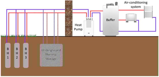 The prototype is designed to work both in conventional mode (Figure 1) and in alternative mode (Figure 2). The conventional mode represents the usual way of implementing and operating a GSHP. The size of the HP (i.e., kWth) is chosen in order to cover the peaks of heating and cooling energy demand during the year, and the geothermal field is sized to match such peaks. Given the specific thermal yield of the implementation site (i.e., kW/m), the number and length of the BHs are computed. In our study, a total exchange length of 360 m (three 120 m BHs) is required, considering a thermal yield slightly lower than 50 W/m. In this case, the plat sizing is performed using a power-peak approach.