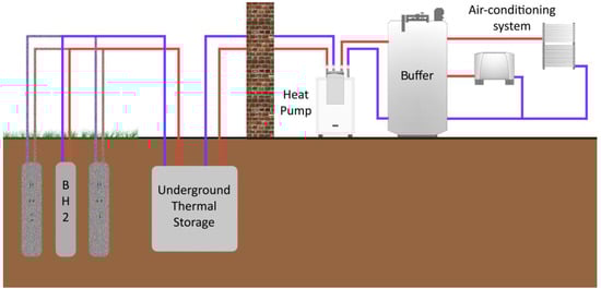 According to the European Directive 28/2009, the output energy produced by a heat pump (HP) system can be considered as renewable energy only if it significantly exceeds the total amount of input energy [11]. In other words, a HP system is defined as renewable energy system according to the measured coefficient of performance (COP). Nevertheless, the exploitation of geothermal energy is affected by many sustainability implications [12]. In particular, the design of a GSHP should take into account several environmental negative impacts, such as the risks of contamination of shallow aquifers and other water bodies, the soil compaction, and habitat loss or disturbance. All these environmental issues are strictly related to drilling activities, which also sensibly affect the initial costs by up to 50% of the total [13]. One of the most effective technological enhancements of current heating, ventilation, and air-conditioning (HVAC) systems is the recourse to heat storage devices (i.e., thermal energy storage—TES), which allows for the optimization of the operational performance, making it possible to accumulate thermal energy (both heat and/or cold) when renewable sources are available and to use this upon demand. The innovation proposed in this work is the inclusion of heat storage in the standard layout of a GSHP to simultaneously reduce the negative impact on the environment and the initial costs of these systems [14]. A further improvement of the prototype has already been proposed, replacing the sensible-heat thermal storage (TS) with a latent-heat TS made of phase-change materials (PCM) [15].