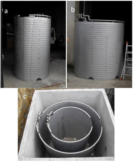 For both modes, a custom data acquisition system allows for testing the prototype performance under real working conditions. For safety and reversibility reasons, two cylindrical heat exchangers (Figure 3a,b) are placed within the underground tank (Figure 3c) to avoid the mixing of the storage fluid (i.e., water) and the heat transfer fluid (i.e., water and propylene glycol). The TS can be bypassed to switch the system to the conventional mode. The heat exchangers are grouped in two units connected to the HP and BH loops. Each unit is formed by an energy exchange surface of approximately 20 m2.