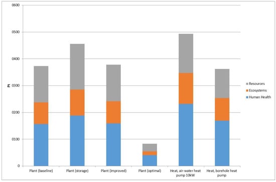 According the measured environmental indicators, energy consumption was by large the most impacting process, with the only exceptions being ozone depletion and metal depletion, which were mainly due to the HP and HP plus storage, respectively. Energy consumption being determined by the system’s COP, the latter was the parameter to which the results were the most sensitive.